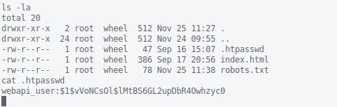 During enumeration of the _httpd account, I notice the presence of .htpasswd in /var/www, which is also the home directory of _httpd.