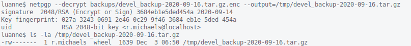 During enumeration of r.michaels’ account, I notice the presence of a backup directory which appears to contain an encrypted file.